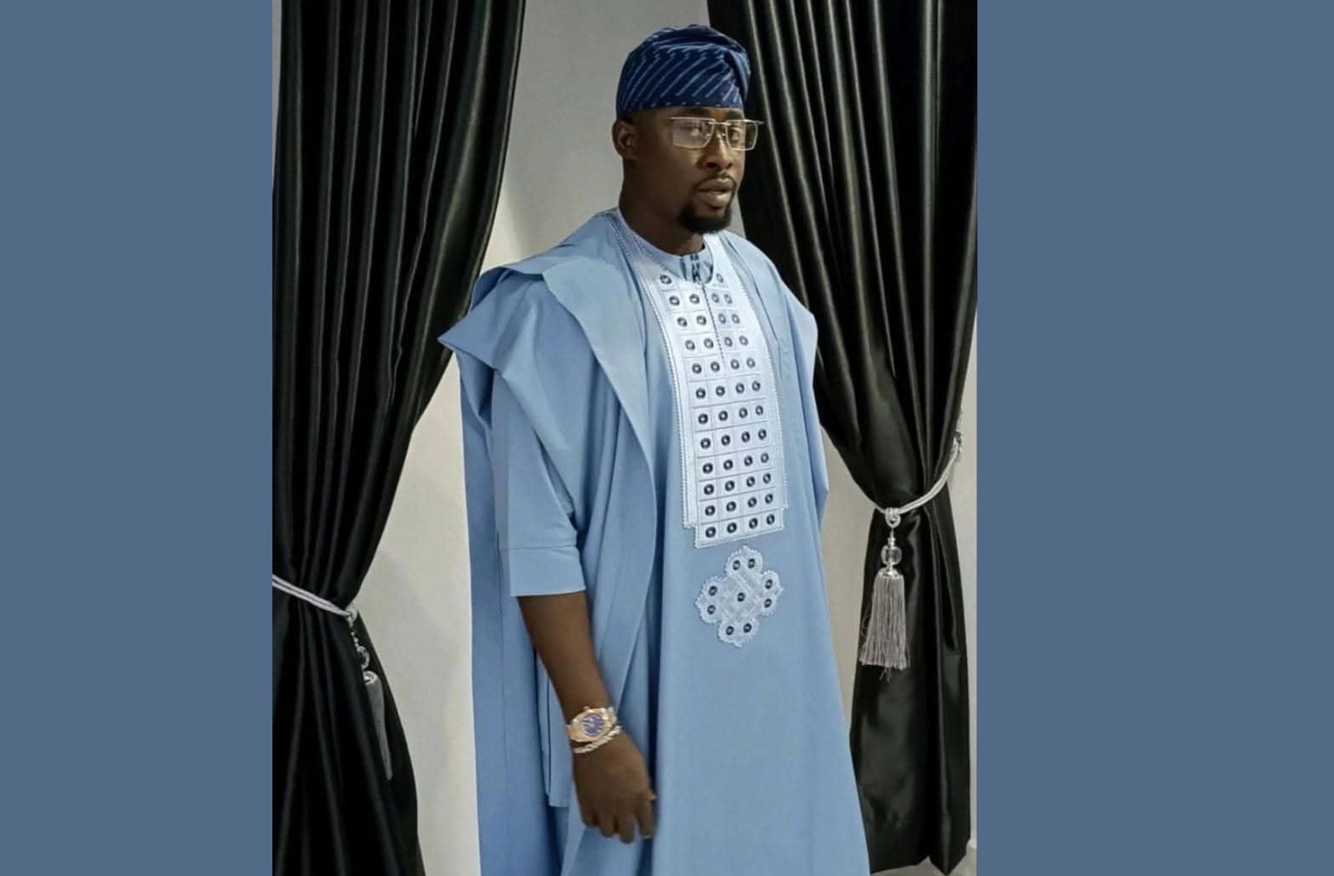Elegant Light Blue Embroidered Agbada with Matching Fila