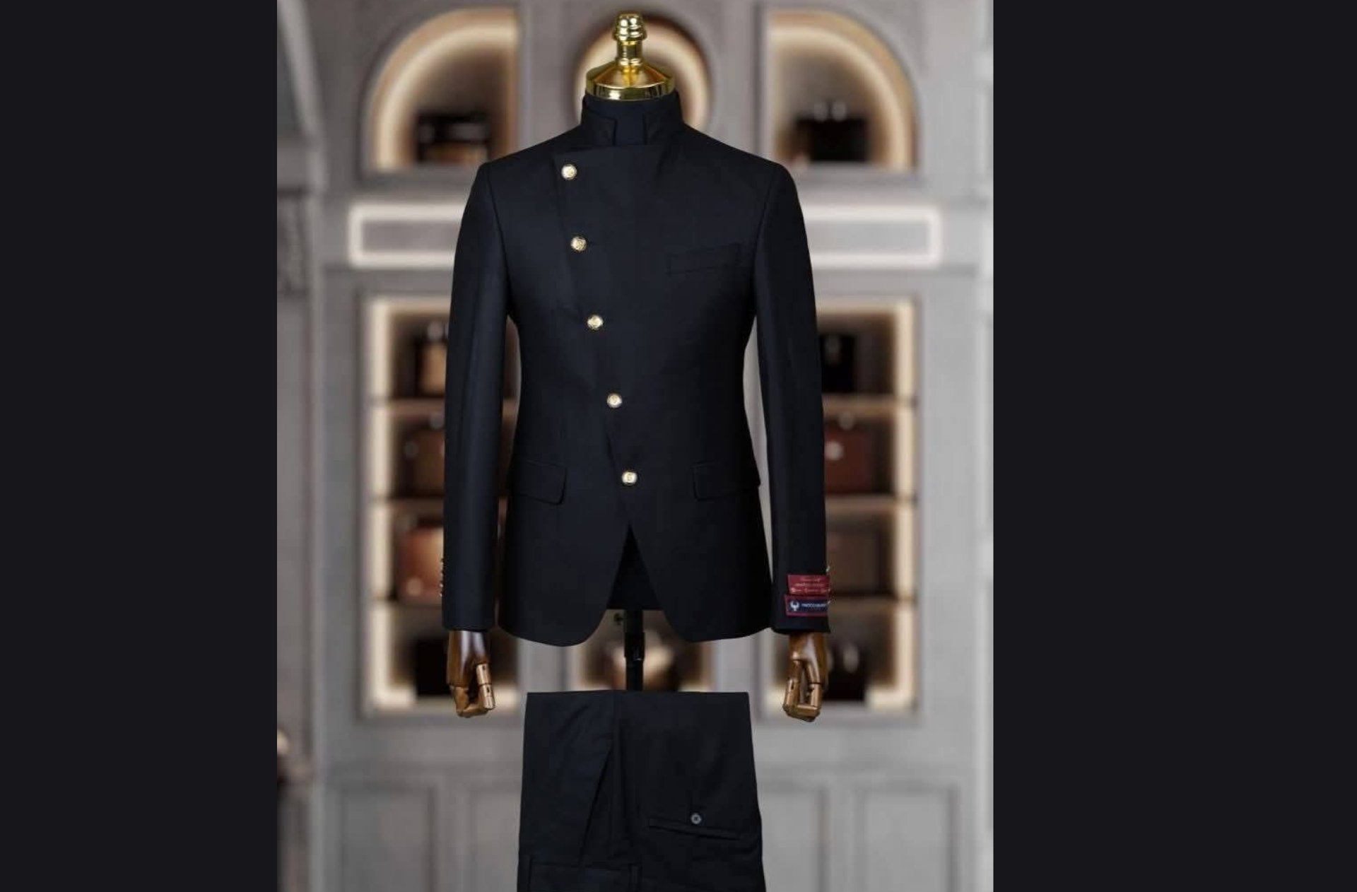 Make a refined cultural statement with this elegant black top by Amana Design, featuring intricate gold geometric embroidery on the pocket and sleeve cuffs. Perfect for formal events, ceremonies, and a sophisticated daily look.