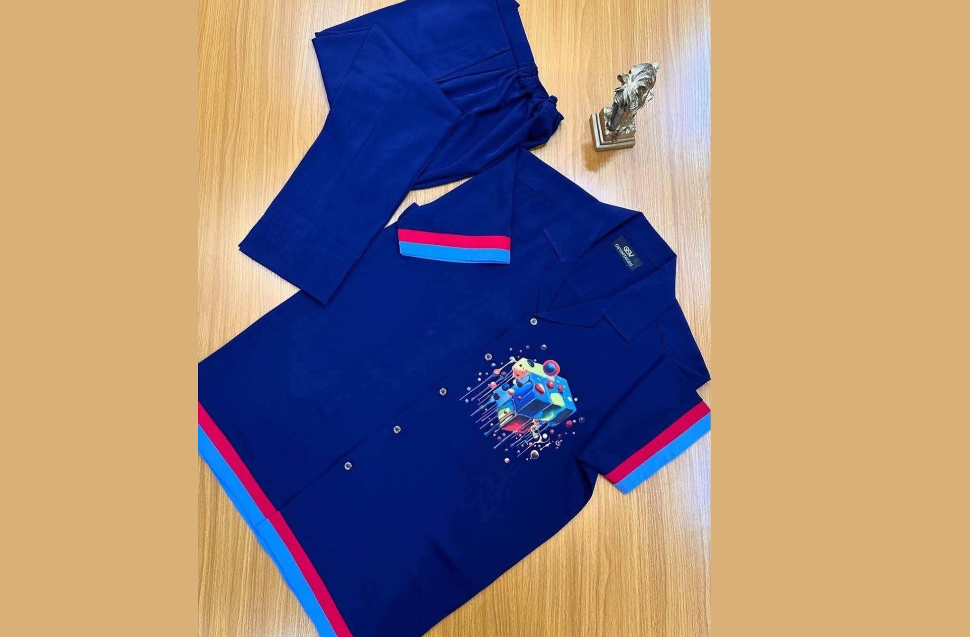 Step out in style with this trendy navy blue two-piece co-ord set, featuring a vibrant abstract graphic print on the shirt and contrasting red and blue accents. Perfect for casual outings, relaxed gatherings, or a fashionable statement.