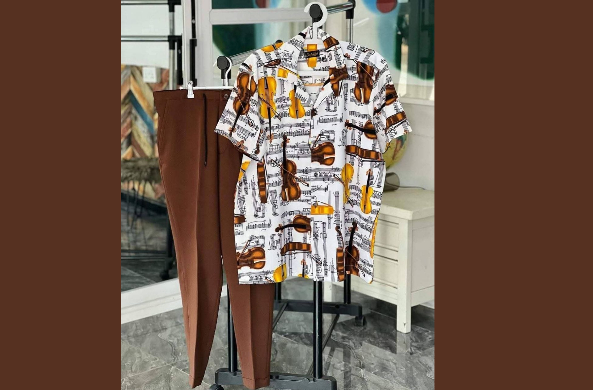 Embrace a relaxed and artistic style with this unique cream and brown two-piece co-ord set. The short-sleeve shirt features a playful abstract floral print, perfectly complemented by brown trousers with sleek white stripes.