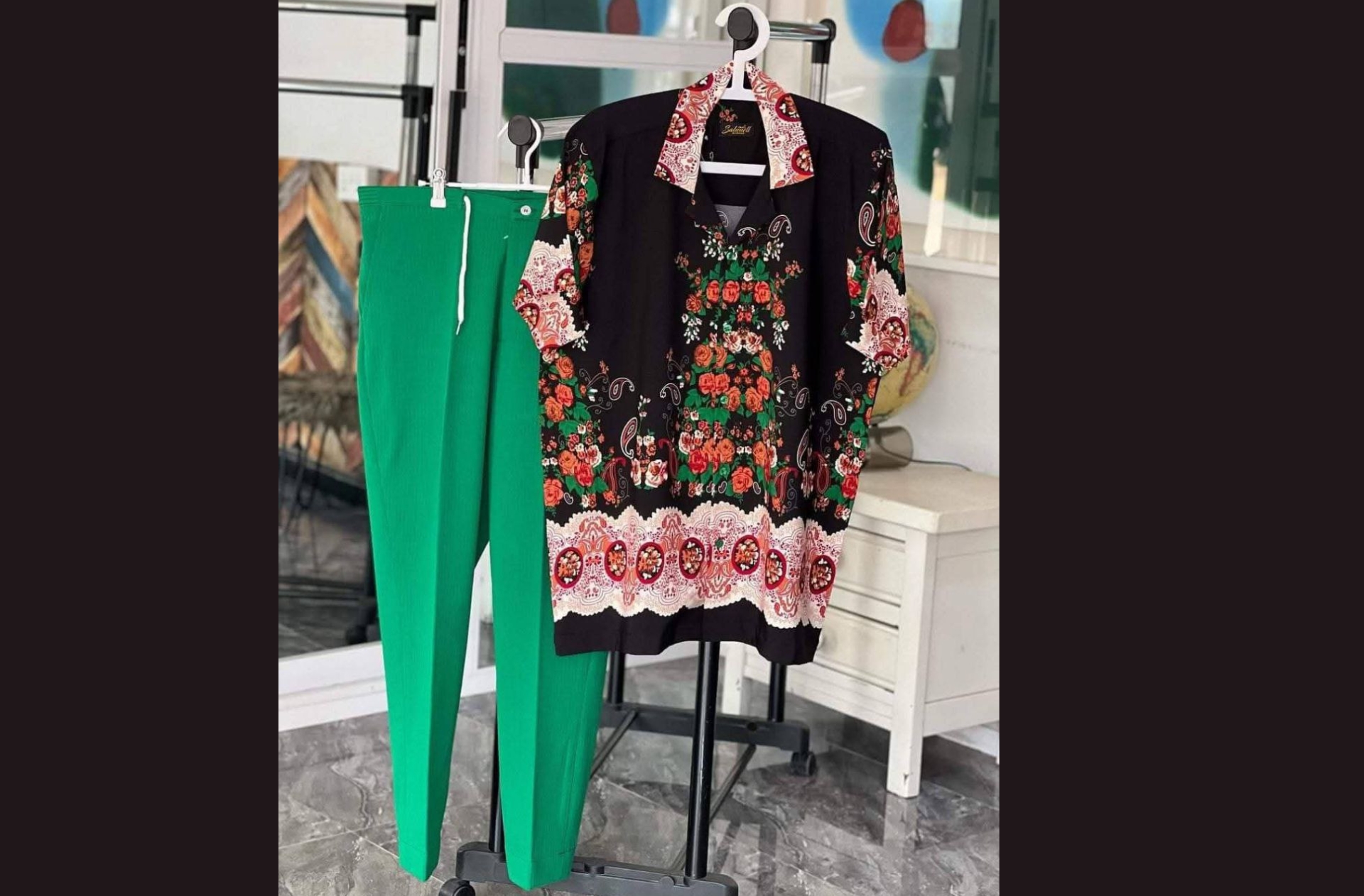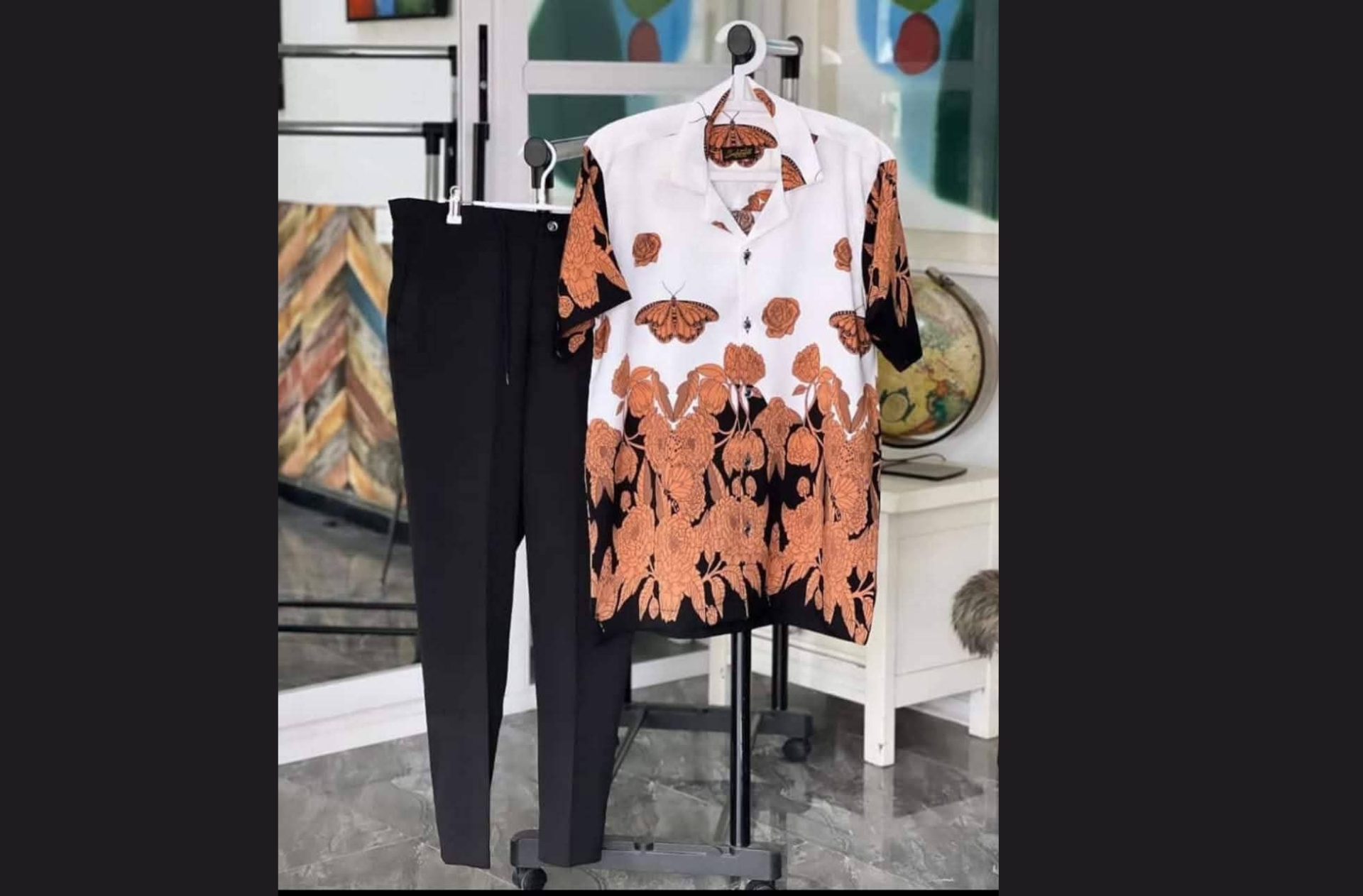 Make a bold fashion statement with this eye-catching two-piece co-ord set. The short-sleeve shirt features a unique orange butterfly and floral print on a white and black background, perfectly paired with sleek black trousers.