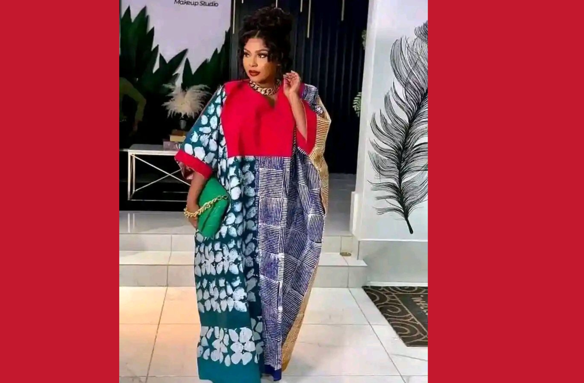 Make a bold and beautiful statement with this stunning kaftan dress, featuring a unique combination of colorful prints including a red bodice and various blue and white patterns. This free-flowing, elegant piece is perfect for special occasions and making a fashionable statement.