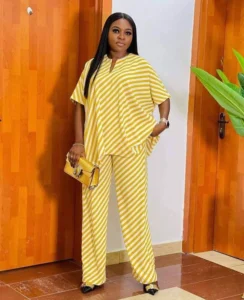 Make a bold and stylish statement with this Chic Yellow Striped Kaftan Two-Piece Set. The ensemble features a relaxed-fit kaftan top with matching wide-leg pants, designed to bring comfort and elegance to your wardrobe. The bright yellow and white striped pattern adds a touch of vibrancy, making it perfect for casual outings, brunch dates, or summer events.