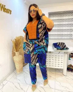 Step out in style with this Elegant Ankara Two-Piece Set, featuring a vibrant tunic and matching tailored pants. The outfit combines bold African patterns with a modern design, offering a perfect balance of tradition and contemporary fashion.